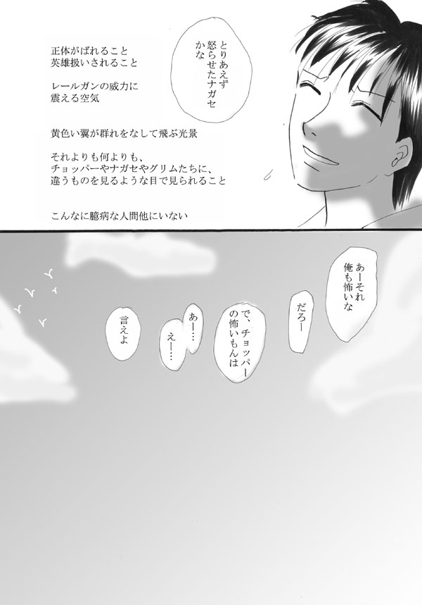 2005年のSCCにて出した突発無料ACE本「farhestskies」に載せた漫画部分。 これと小説でかいた分の1を本にしたものでした。 当初はただのブレイズとチョッパーのつもりだったのですが、なんだかかいててメビウスなブレイズになってしまったという。 アレー!?まあいいです。ハハハ。 |ω・`)<なので当初は書き分け(髪型で(爆))しようと思っていたブレ=メビとただのブレが同じ顔ですがキニシナイ。 チョッパーが大変弱弱しいのは疲れているのと相手がメビウスなブレイズだからです。ハイ。というかもう単純にうちのサイトがチョパ受だからでもいいよwwww←投げやり