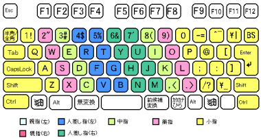 見ての通り何も考えず配列された運指ですね。まぁ慣れてしまえばこれでも速いもんですけど。まぁ英語打つ分にはこれでもいいのかも知れませんが、日本語では非効率面もかなりあるはずですわな。そもそも配列からして英語用ですから、これで日本語打つ方が間違っているといえば間違っているわけで。ハイフンなんかとくにそうだけど、日本語の出現確率で配置したら絶対こうはならないはずなんだよね。 日本語打つなら素直にかなで打てってことかしらね。