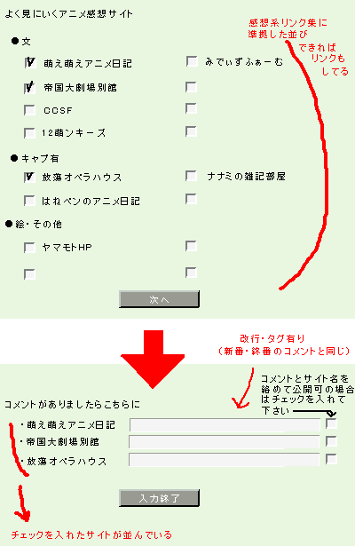 匿名さん: PCトラブル解決お疲れさまでした〜。 何をやろうアンケート、地域別調査に投票したんですが感想サイトが選ぶ好きな感想サイトにも興味ありますー。でも、これってどうやって集計するんでしょう??? 思いっきり手作業になりそうで、それはそれで大変そうなので下手に要望するべきじゃないのかなー。 女性的視点。 お、これいいですね!これなら管理人さんの性別関係なしに使えそう。 長文になってしまって失礼しました。 ではでは〜♪ 好きな感想サイト調査の現状考えている仕様はこんな感じ。↓