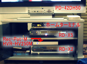 ハイビジョンレコーダー。前にも書いたI-O DATAの[RecPOT-M HVR-HD250M]です。 自身はチューナーをもたずi-Linkのみというある意味潔い設計がナイスです。CATVのチューナー経由な環境にはベストマッチの製品ですな。 でもがっつり使うには容量250GBは結構足りない感じ。地上波デジタルを録るにしても、26時間程度しか録れないそうだ。普通のHDDレコーダー感覚でいうと120GBぐらいといったところかしらね。こまめに見て消していきたいところだけど、チャプター分割>削除という機能はないため、消すまでに結構時間がかかってしまうところが難点か。 でも無劣化録画にはかなり感動。美し…。早くD-VHS以外にハイビジョン録画できるメディア出ないかなぁ…<ブルーレイディスクは却下で。 これで、・RecPOT=見る用・RD-X5=録る用&残す用&手キャプ用という棲み分けができるようになったかな…。 ついでに、ネットdeモニターするには転送量が厳しかった無線LANの801.11bも新しい無線LANに買い換え。 前買ったイーサネットコンバーターとセットになってたりする [WN-AG/A] にしてみた。よくわかんないけどSuperGモードで動作中。 ネットdeモニターがそれなりにちゃんと見られるようになったし、以前の無線LANアクセスポイントさんは長時間動作させると熱がこもって電波を飛ばしてくれなくなってたりしてたのですが、とりあえず一晩つけっぱなししてみたけど、大丈夫だった。時代は進歩している…。 WN-AG/CとWN-AG/Aの両方を手に入れたことにより、右の写真に写っているように、足がふたつにできたことが結構うれしかったり。それぞれひとつしかついてなくて、ひとつだと結構バランス悪くて使えなかったのよね…。ということでWN-AG/Cの方は横置きに寝てます。 これで手キャプも楽々です。 というわけで現在の自室はこんな感じ。無計画に増えているような…。 流れとしては、・自室にテレビを置きたい→自室用のレコーダーが必要→基本的に見る奴を全部録るとなると普通に考えてW録&大容量→RD-X5→テレビもどうせなら大きいのがいい→薄くないと2階まで運べない→といいつつ設置までしてもらったので重いのでも大丈夫だった→モデム・ルータは1階だから無線LANでRD-X5に接続する環境を構築→CATV経由でデジタル放送を受信可能に→地デジやBSデジタルでテレビが本領発揮→テレビがハイビジョン用なので地上波(RD-X5で録画したもの)がショボーンであることに気づく→なるべく生見→大変→ハイビジョンレコーダー必要こんな感じ。何だか途中からRD-X5&無線LAN環境の意味がほとんどなくなっているような気がしなくもないですが…。行き当たりばったりだとこういうことになるという見本…。 基本ハイビジョンレコーダーで録るなら、通常HDDレコーダーはそんなに大容量である必要はなかったかも。…まぁ、いいか…。とりあえず楽しいし、ハイビジョンはきれいだし。今日のコナン映画だって、エンディングの歌詞までくっきり見えるのに感動してもた。 次は5.1サラウンド環境だろうか…。RDシリーズのDVDプレイヤーとしての能力にも結構疑問があるし…。むむ…テレビから始まる散財スパイラルに堕ちていくような…。