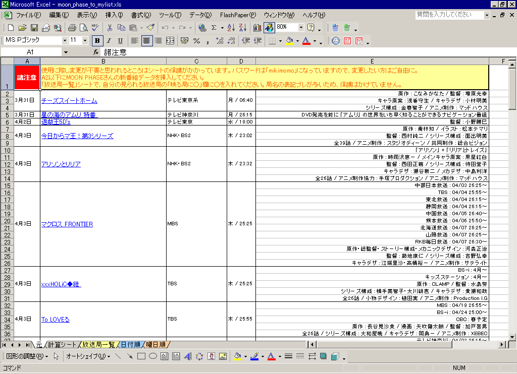 アニメ新番組リストマイリスト抽出Excel_画像2※クリックで原寸表示