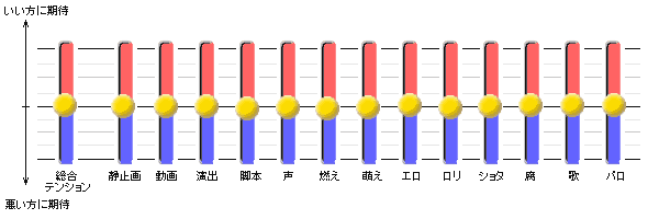 とりあえず画像のやつと同じゲージ構成で使ってみるの図。各要素は作品によって増減するというか、テンション0で変動予定のないところはゲージがないのと同じですな。JavaScript的には要素数はどこまでも増やせるけど、1024×768環境では14要素ぐらいが限界だ。つまみにカーソルを合わせると大抵のブラウザではツールチップが出ます。