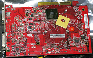 で、外したグラボを見てみると、なんか黄色いぷにょぷにょしたシートが適当なところに貼りついている…。これたぶん、放熱シートだよなぁ。つまり熱すぎてまともな画像処理ができなくなっていたのか。