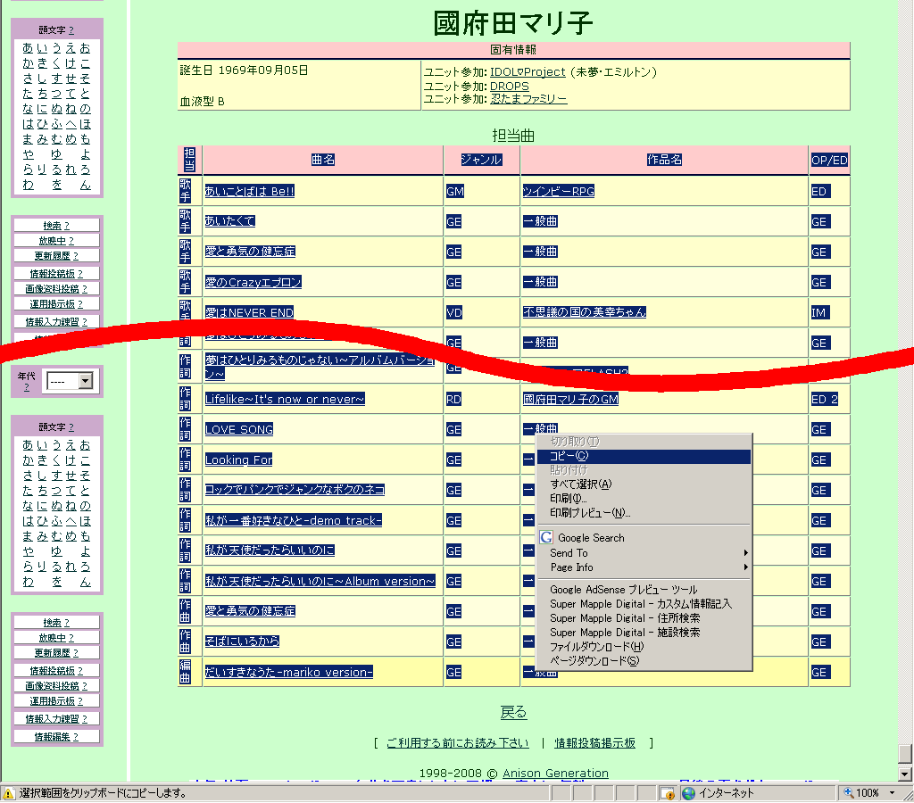 3. 作品情報なら「使用曲」、人名情報なら「担当曲」の表を選択し、コピーする