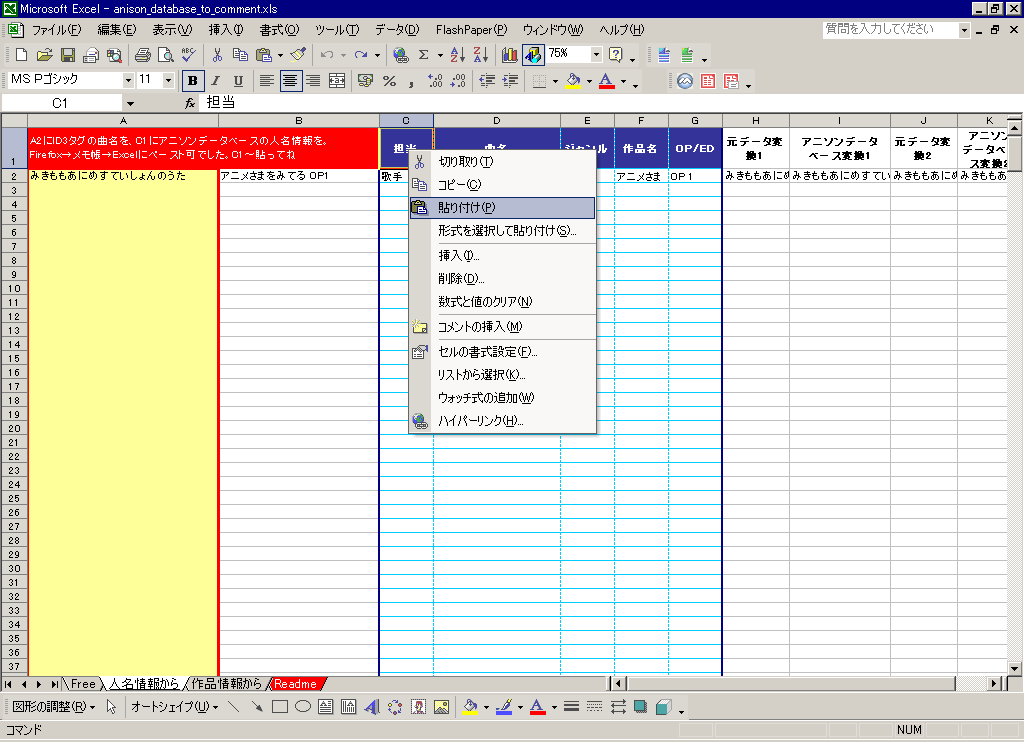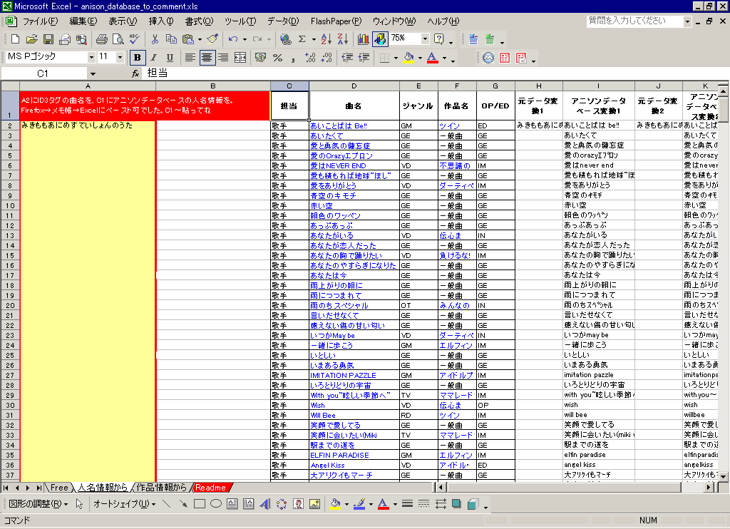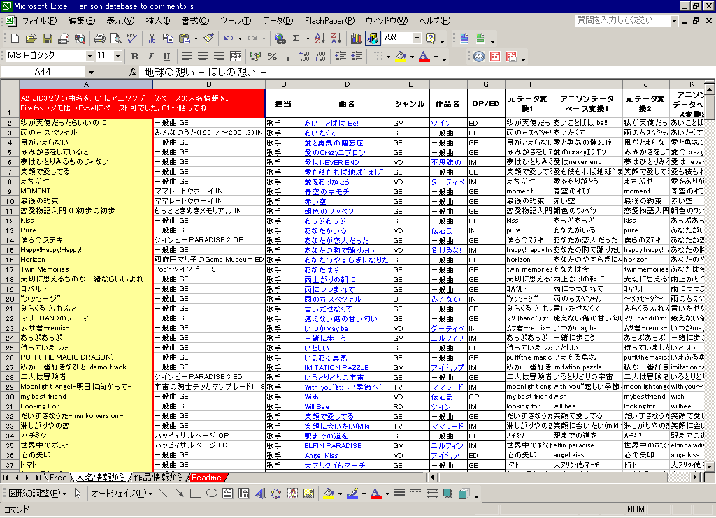 • A2〜に貼り付けた曲名は維持します。アニソンデータベースでの表記には変換していません。