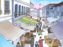 写真は確か東側です(記憶が曖昧なので違ってたら西側も見てみてください)。比べてみると、後景の差異はかなり多いので、後ろの方は別の場所かそれっぽく描いてあるだけかもです。他にいくらか回ってみた市場にはここより似てるところはありませんでした。街灯の位置から推測するに撮影場所はもう少し下の方がよかったかも。