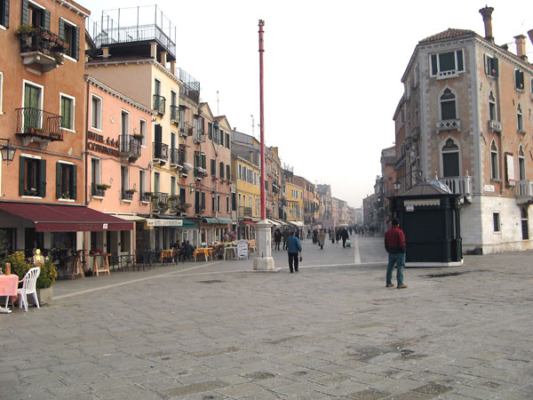 そもそも運河じゃないじゃないか、と言われてしまいそうですが、地元の人の話によると、こういうだだっ広い道はだいたいのところ埋め立てで広くなった道だそうです。もともとは写真に見えている白線のところまでがフォンダメンタ(運河脇の道)で、真ん中のところは運河だったと。